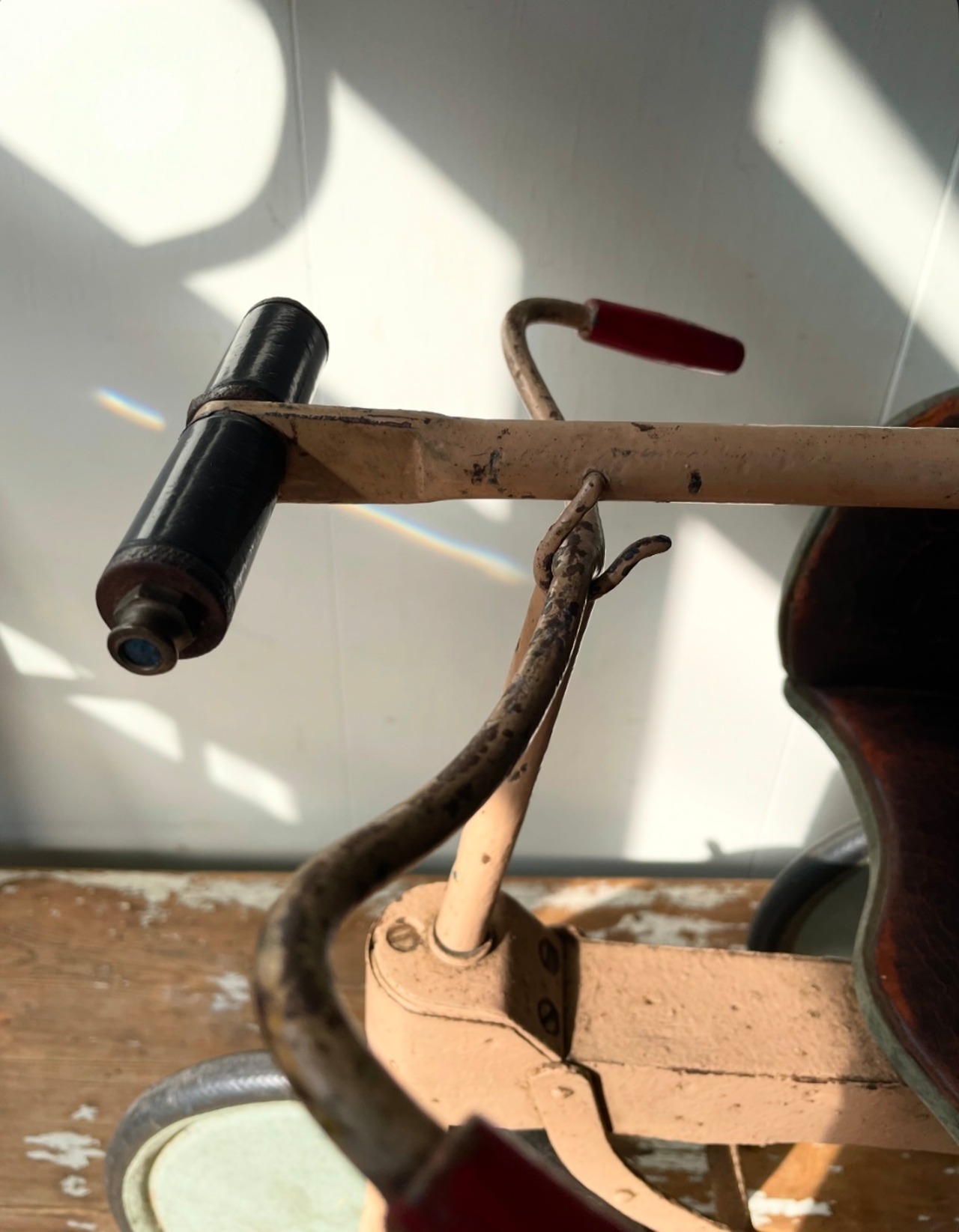 また後ろのハンドルは三輪車のハンドルと連動しており実用性たっぷりですが、前輪に補修跡がありますのでディスプレイ向きでしょうか。