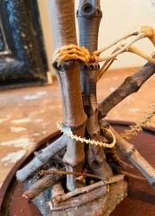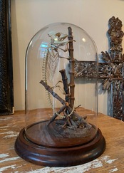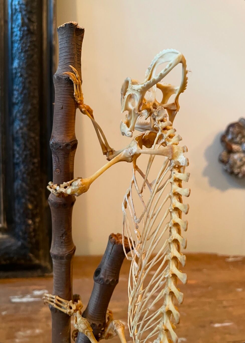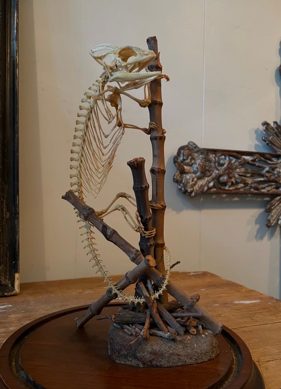 ガラスドームに入ったエボシカメレオンの全身骨格標本です。