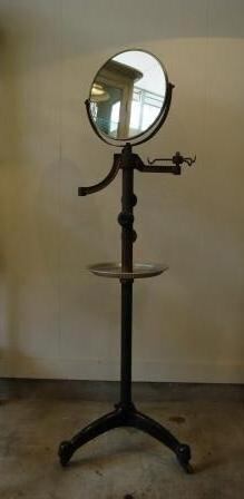 キャスター付きの鉄鋳物の脚にアルミ製のトレー、ベークライトのコンセントや鏡が付いたものです。